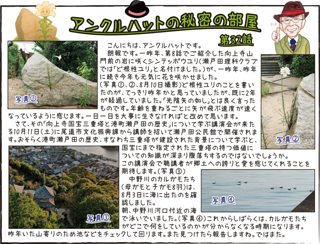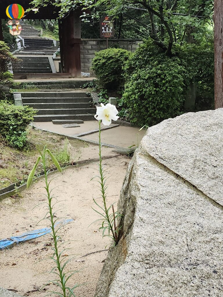 朗報です。🌸一昨年、第8話でご紹介した向上寺山門前の岩に咲くシンテッポウユリ(瀬戸田理科クラブでは「ど根性ユリ」と名付けました。)が、一昨年、昨年に続き今年も元気に花を咲かせました。🌼(写真①、②、8月10日撮影)