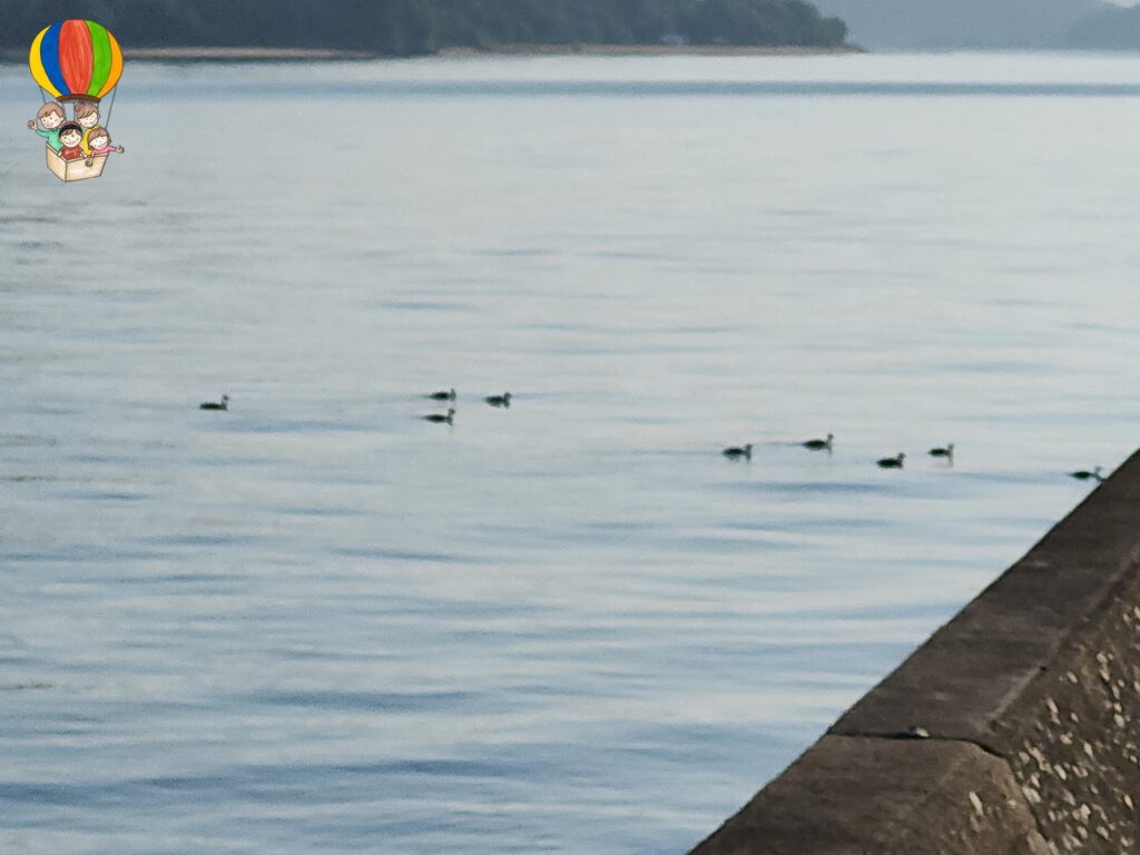 中野川のカルガモたち(母ガモと子ガモ8羽)は、8月3日に海に出たのを確認しました。🦆朝、中野川河口付近の海で泳いでいました。🌊(写真④)