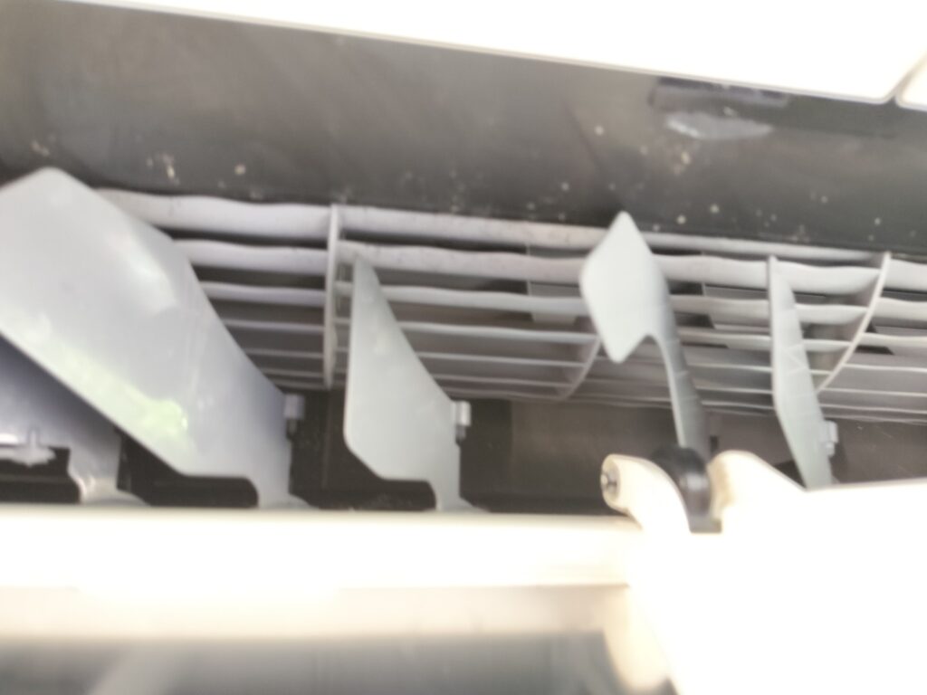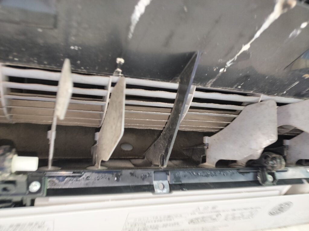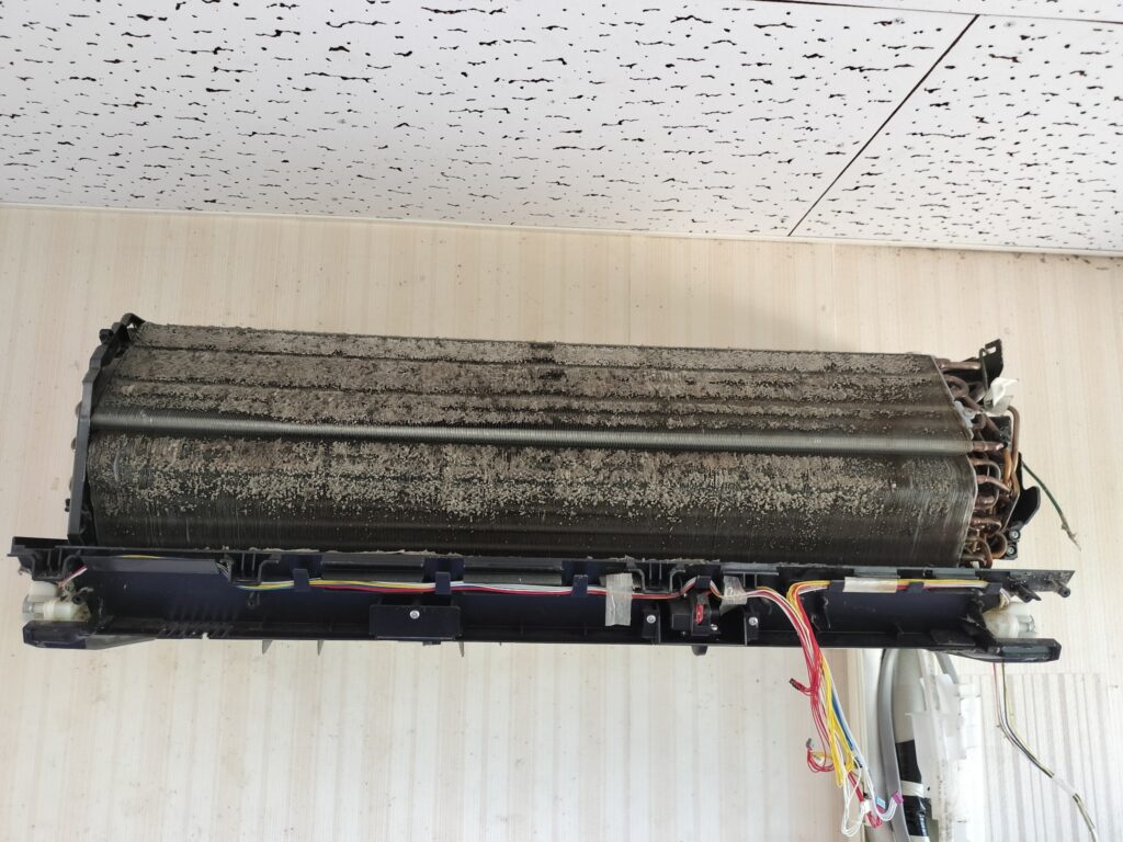 フィルターを通り越したホコリが、そのまま奥の熱交換フィンにビッシリ詰まっていました…。