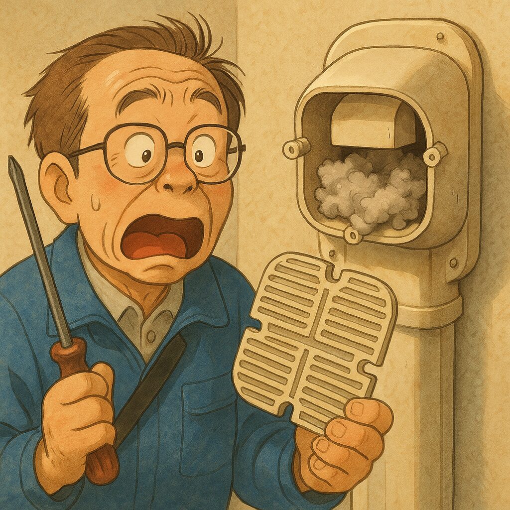 エアコン修理 X Facebook はてブ LINE Pinterest コピー 2025.11.122025.11.18他店お求めエアコン工事修理依頼。🔧自動お掃除機能付きの、自動排出型のお掃除ロボの出口の防虫格子は取り除きましょう。🚫🐛
