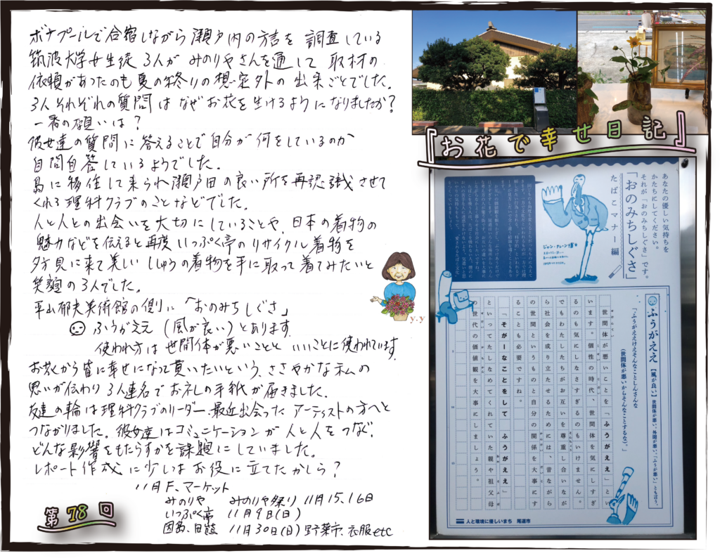 ボナプールで合宿しながら瀬戸内の方言を調査している筑波大学女性生徒3人がみのりやさんを通して取材の依頼があったのも夏の終りの想定外の出来ごとでした。3人それぞれの質問はなぜお花を生けるようになりましたか?一番の願いは?彼女達の質問に答えることで自分が何をしているのか自問自答しているようでした。