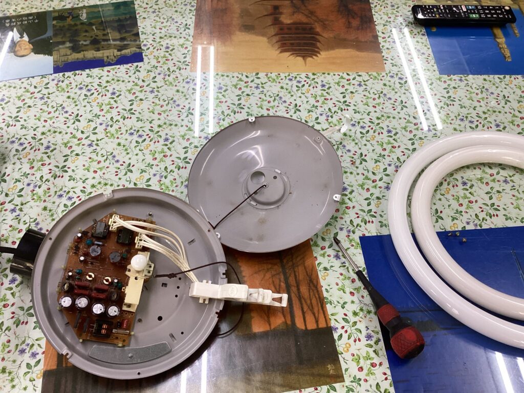 生口島(瀬戸田町 御寺・S様邸)愛着のあるレトロな30年前のサークライン照明器具を修理し手再び明かりが元通りになりました。🔧💡