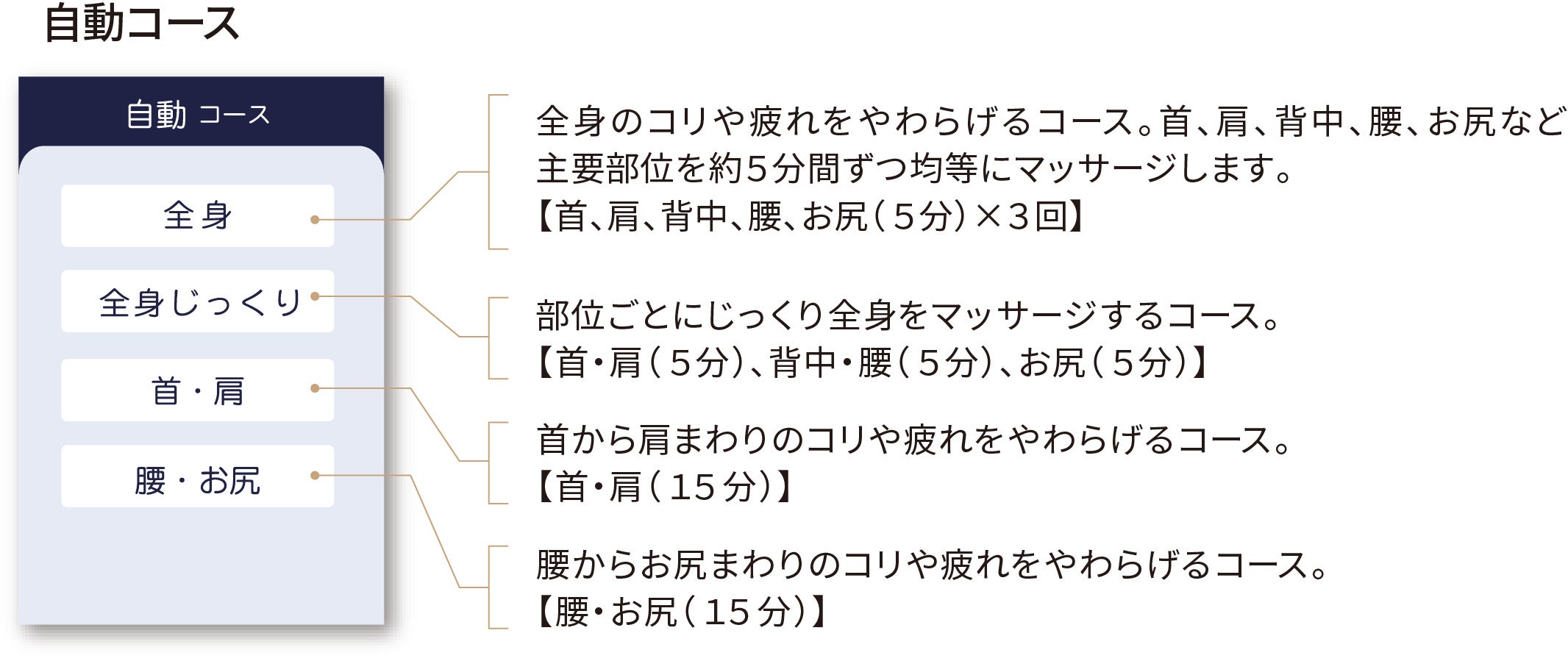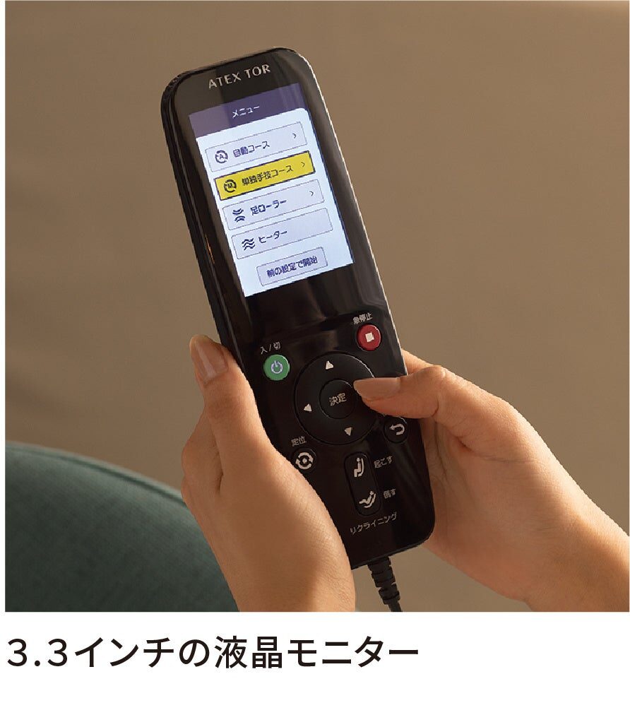 使う人のコリに合わせて多彩なコースを搭載しています。自動コースは「全身」「全身じっくり」「首・肩」「腰・お尻」と合計4種類あり、その日の疲れに合わせて選べます。手動コースでは、もみ・たたき・指圧・リズム・伸ばしの5つの手技で強さや速さなどを、好みで選べ、最大45通りの多彩な組み合わせができます。また、液晶は3.3インチで大きく見やすい表示で、簡単に操作ができます。