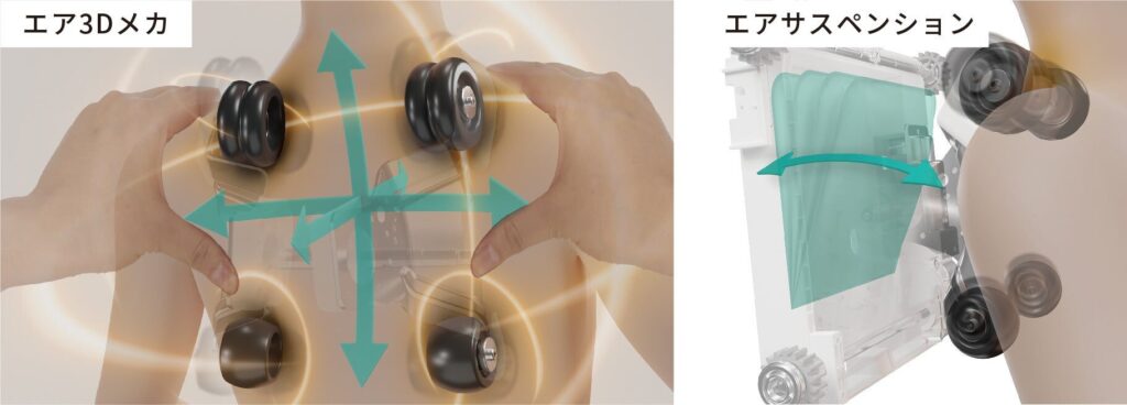 「エア3Dメカ」を搭載し、プロの手技である“もみ、たたき、指圧、リズム、伸ばし”を再現することを目指しました。当社独自のエアサスペンションが使う人に合わせた微妙な調整を行うことで、もみ心地を向上させ“優しくもむ”と“強くもむ”を兼ね備えたプロ仕様のマッサージをお届けします。