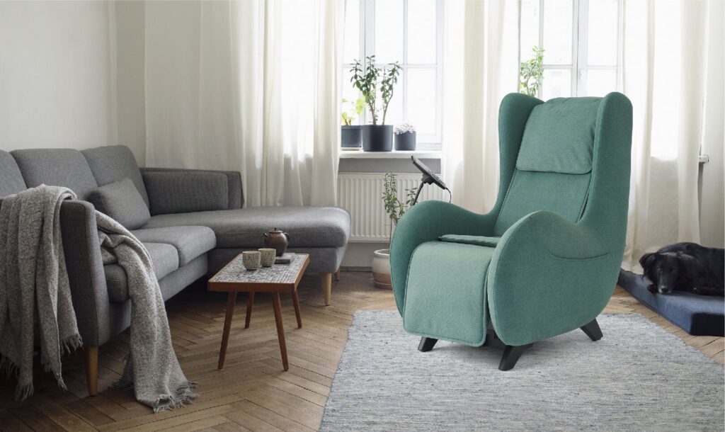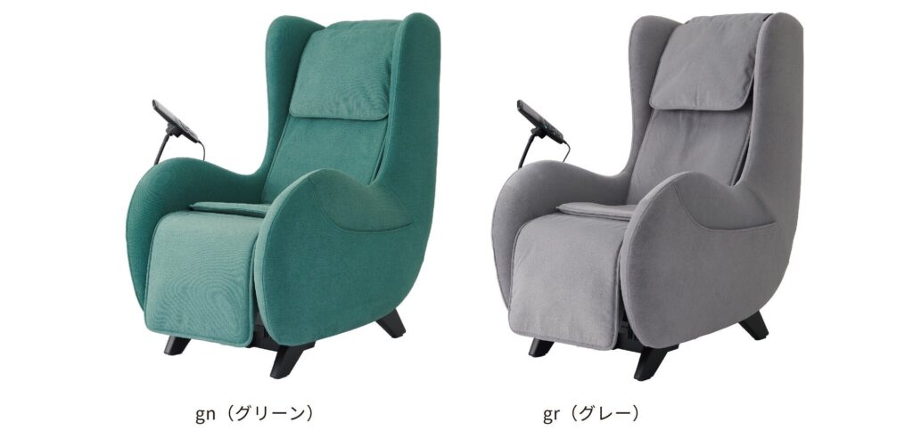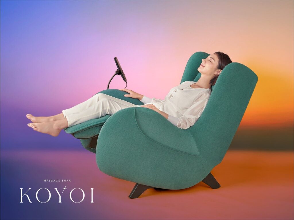 本製品は全身を包み込む丸いフォルムと、視線や音をやわらかく区切るサイドウィングで、リビングに居ながら自分だけの空間を作り出します。また、大型マッサージ機には珍しいグリーンやグレーのファブリック素材が、どんなインテリアにも調和し上品な雰囲気をもたらします。品名である「KOYOI」には、『今宵』の静かな夜と『良い』の肯定感を込め、毎日のリラックス時間をプレミアムにする願いが込められています。