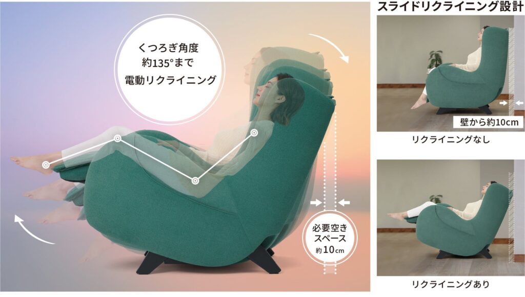 リラックス姿勢を追求した独自機構「ゼロリクライニング」を搭載しました。ふくらはぎが心臓に近い高さまで上がり、ソファとして長時間座っていても快適に過ごせます。また、リクライニング時は前方へスライドする「スライドリクライング設計」により、壁から約10cmの隙間があれば設置できます。