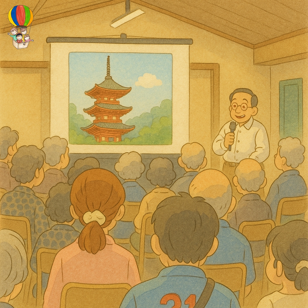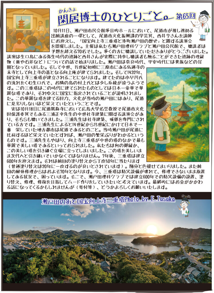 10月11日、瀬戸田市民会館多目的ホールにおいて、尾道市が推し進める出前講座の一環として、尾道市文化振興課の学芸員、西井亨さんを講師にお迎えし、「国宝向上寺三重塔と港町瀬戸田の歴史」と題する講演会を開催しました。🎤