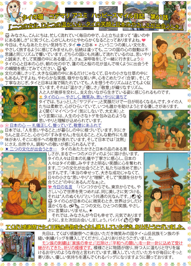 “Tekubari” Friend “Experience the Land of Smiles” Thai Cat, kodemari-Ayumi Happy Smile Diary No61 Topic “✨ Two Cultures, One Warm Heart — When Thai Smiles Meet Japanese Grace 🇹🇭🇯🇵”