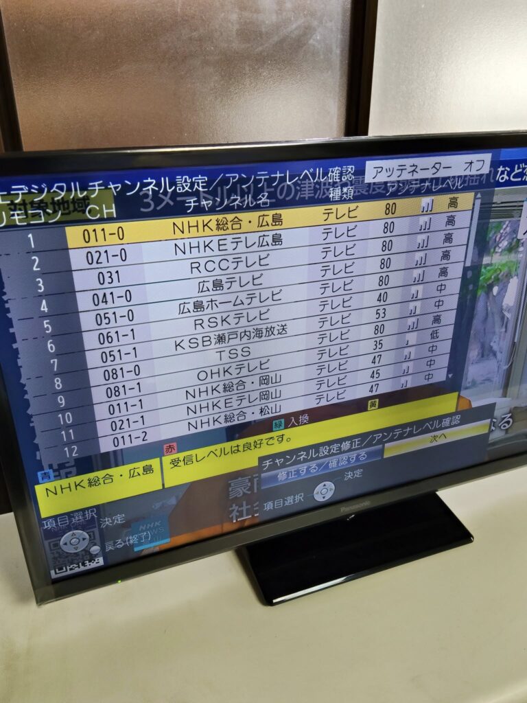チャンネル設定/アンテナレベル確認 をして、受信状態をチェック📡