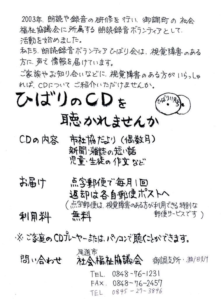 2003年、朗読や録音の研修を行い、御調町の社会福祉協議会に所属する朗読録音ボランティアとして、活動を始めました。🎤