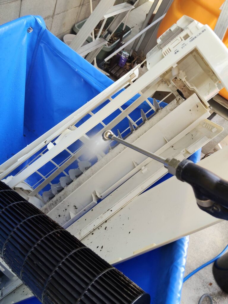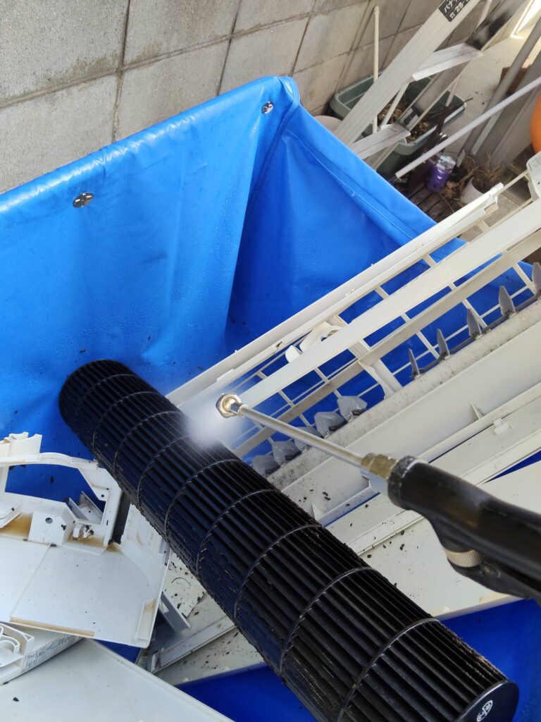 当店では、できる限り丁寧にエアコンの部品を外して、念入りに養生をした上で、専用の高濃度の洗浄液を使い、高圧洗浄で隅々までキレイにするエアコンクリーニングを行っています。🚿✨
