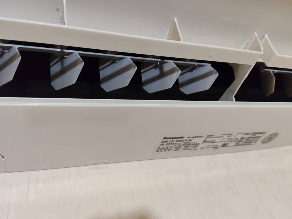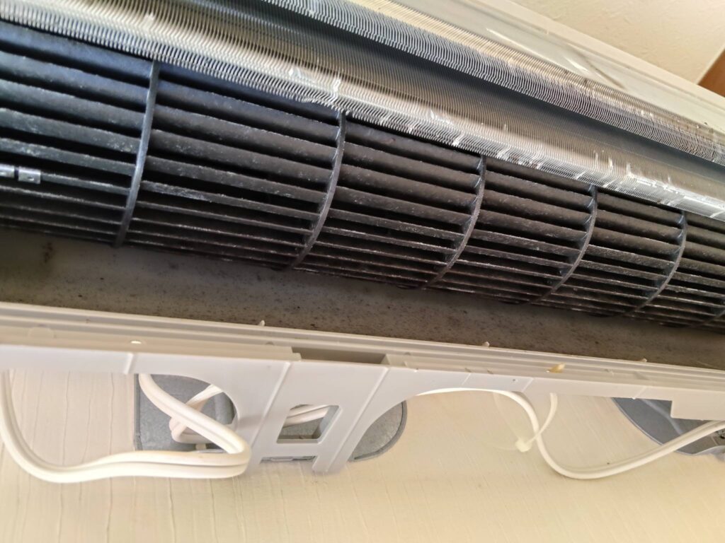 現場に伺ってエアコンのグリルを開けて点検してみたところ、フィルターを通り越したホコリが、そのまま奥の**熱交換器(フィン)**に溜まっている様子でした。😣🌀