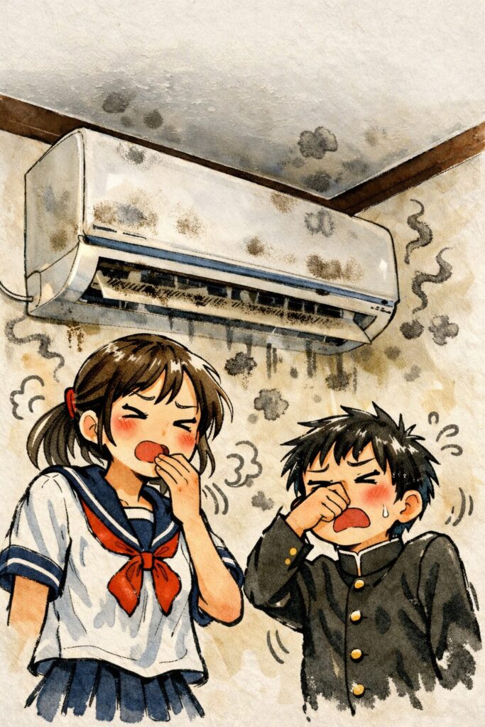 使用した後の湿度の水分がカビの原因となり、熱交換器や吹き出しのファンなどにカビや汚れが溜まっていきます。😷🦠
