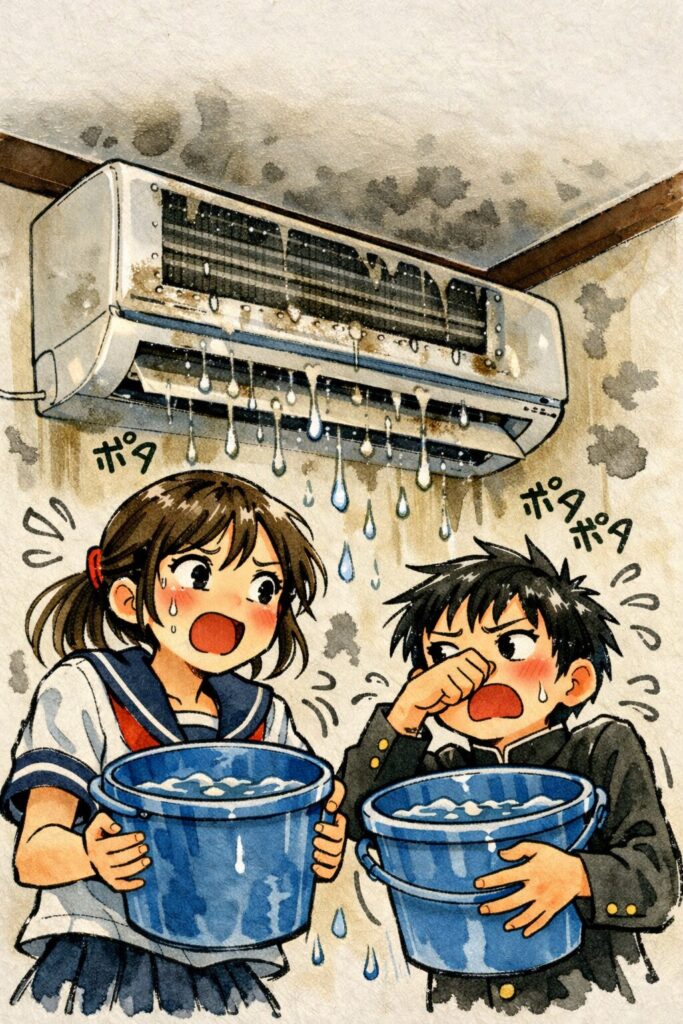 また、熱交換器にホコリが溜まりすぎると、排水の経路(ドレン)の流れが乱れ、室内機側の内部に水滴が落ちてきたりすることがあります。💧😱