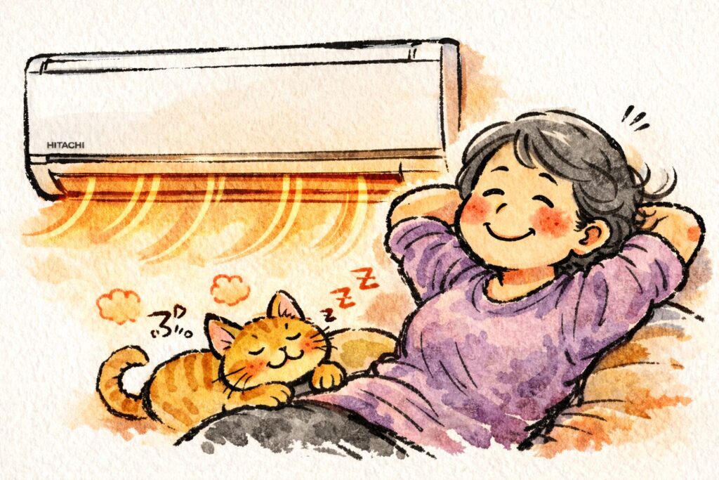 暖房が戻って、お部屋がじんわり温まり、猫ちゃんも安心です。😺